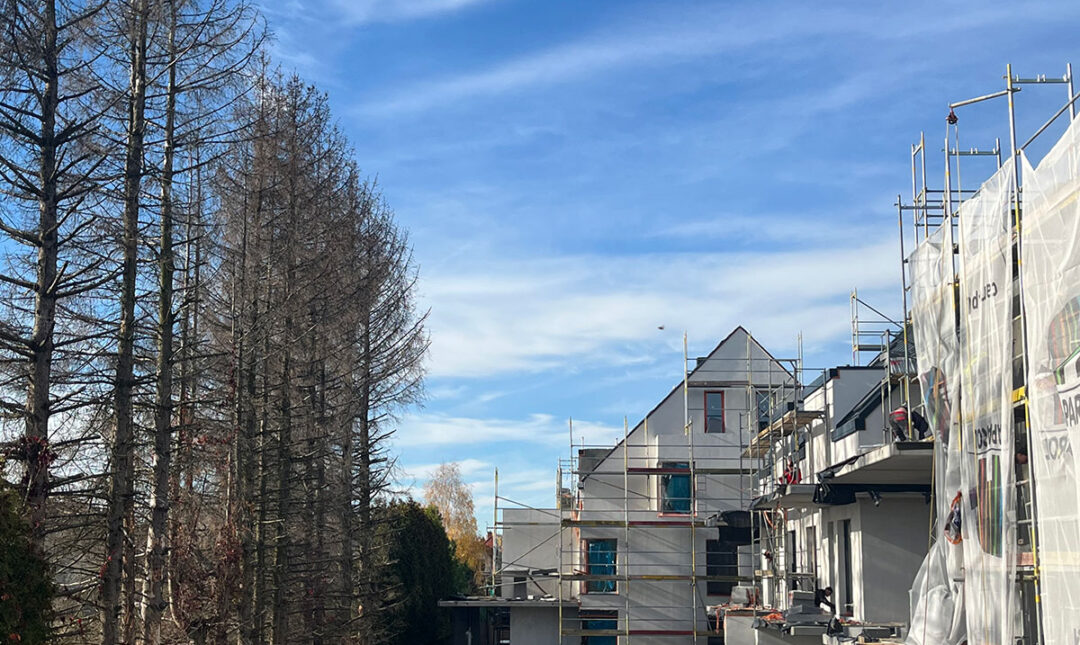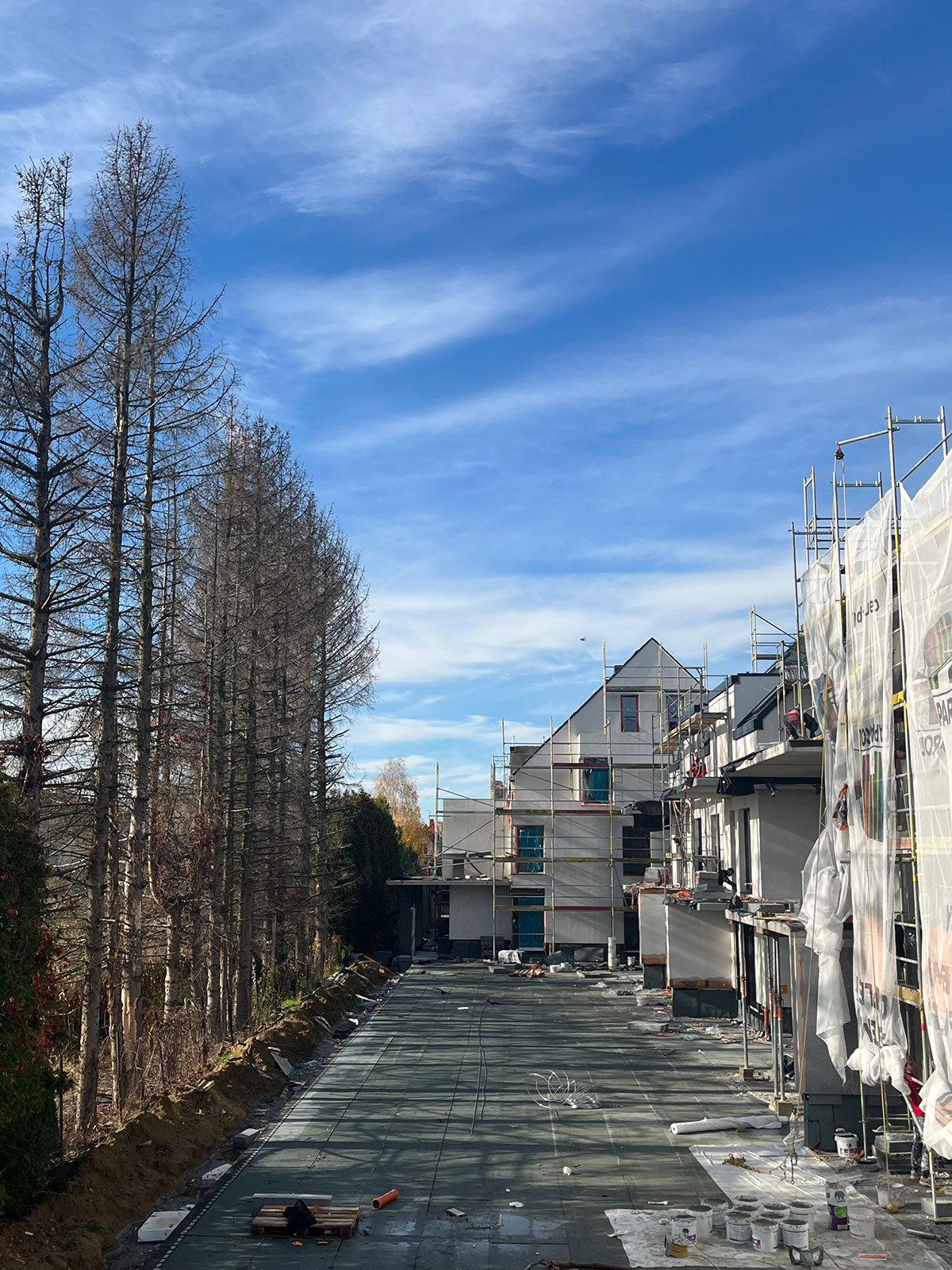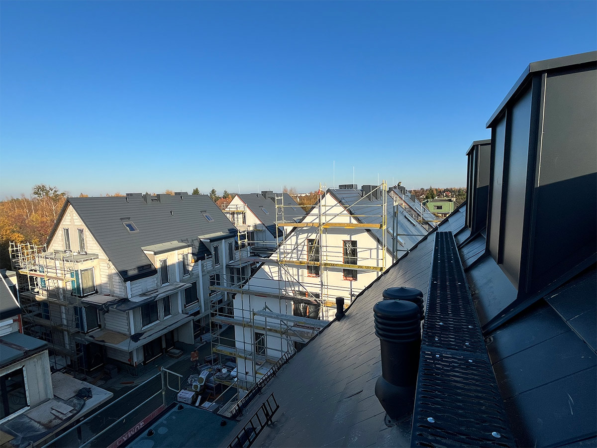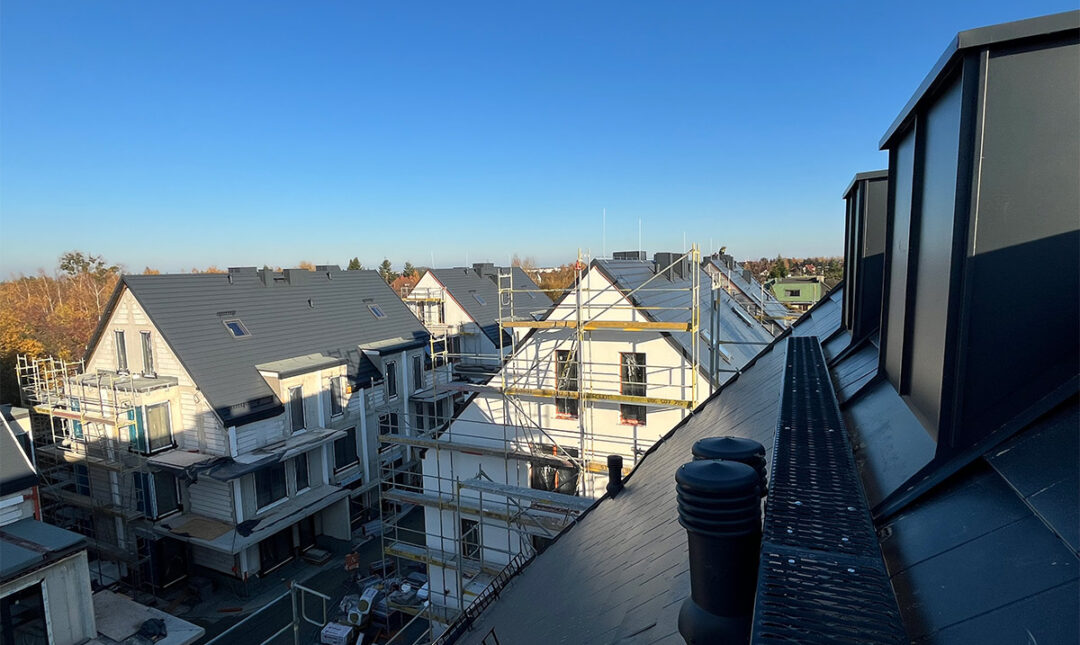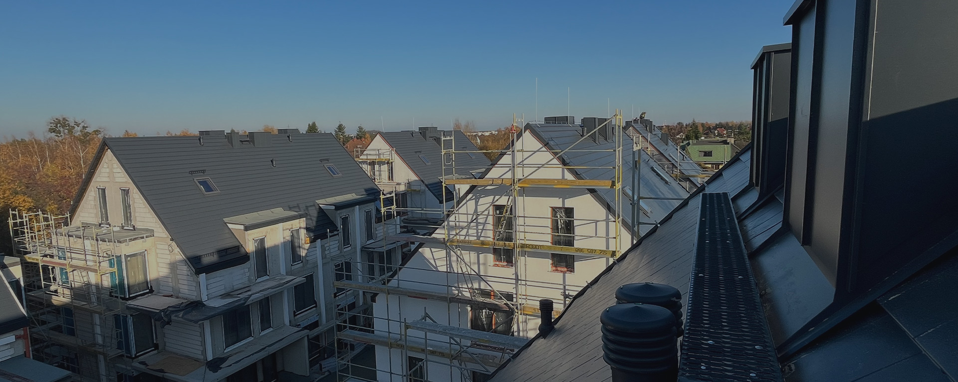 Wykonano więźbę dachową we wszystkich budynkach oraz pokrycia dachowe w budynkach B, C, D, E i F.