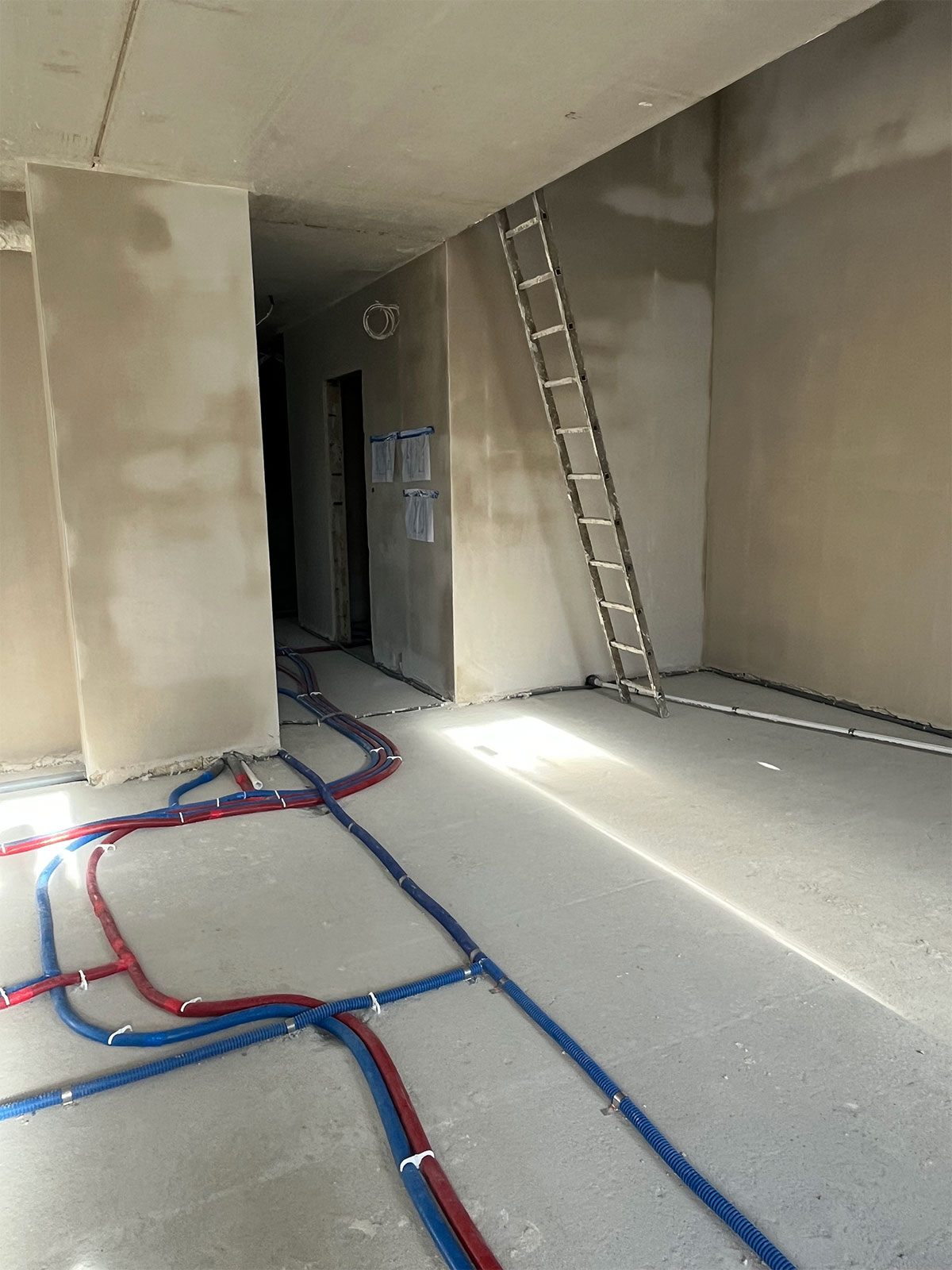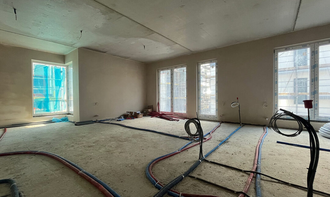 W budynkach F i D trwa montaż instalacji podposadzkowych (centralne ogrzewanie, woda zimna, ciepła woda użytkowa, cyrkulacja, woda szara).