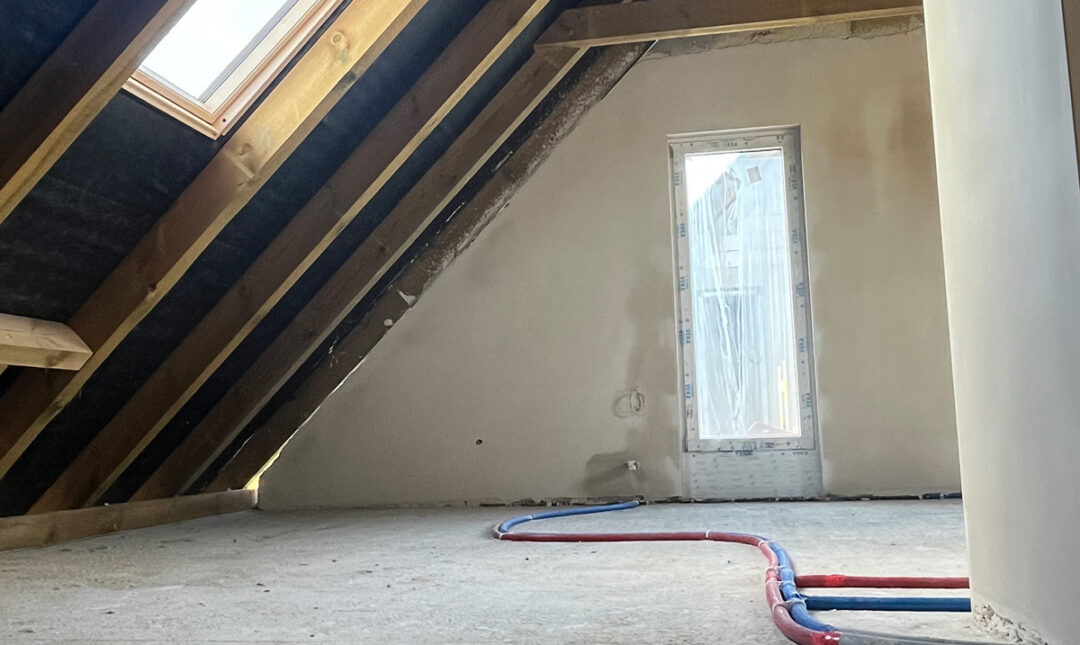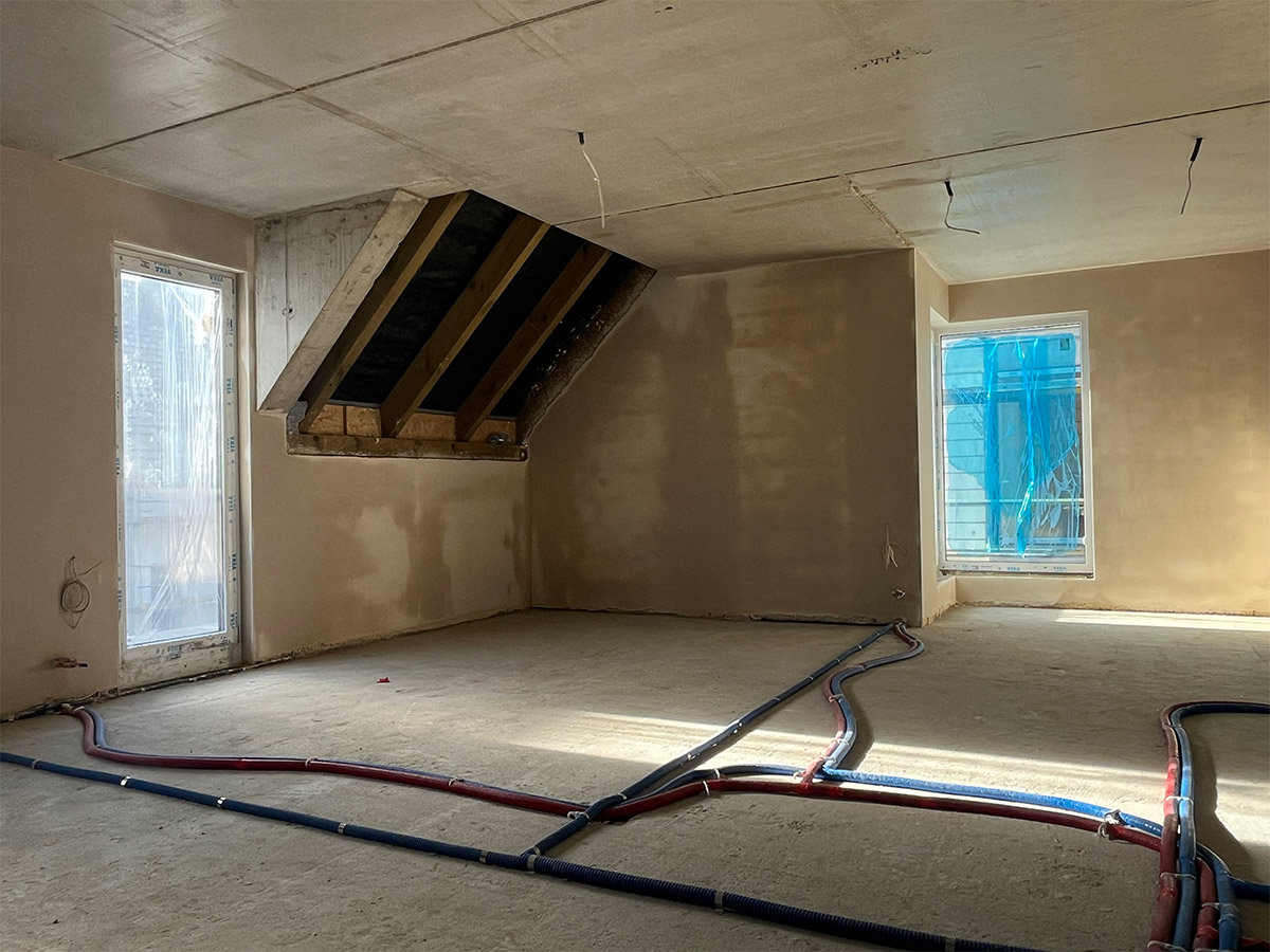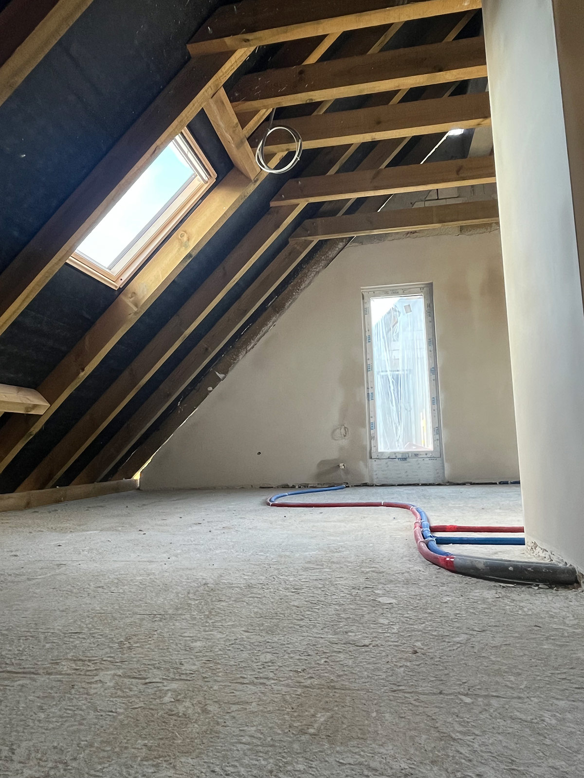 Wykonano termoizolację stropu nad garażem (poza obrysem budynków) wraz z betonową warstwą dociskowo–spadkową.