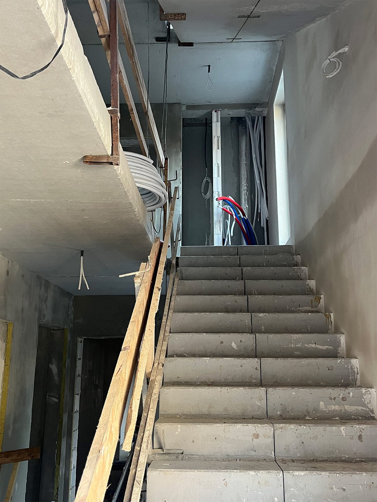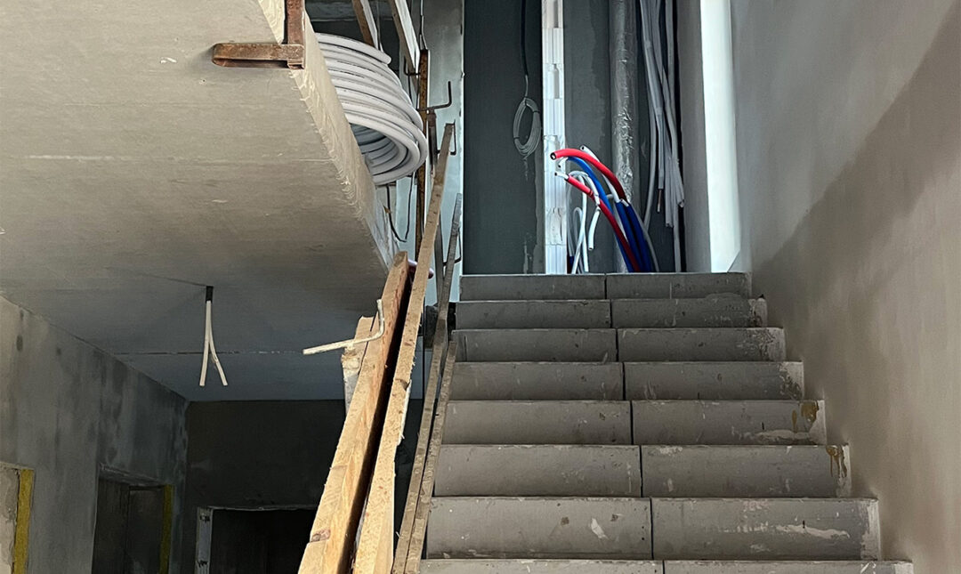 W trakcie realizacji jest wykonywanie instalacji elektrycznych, niskoprądowych oraz systemów SMART w budynkach A, B, E, w tym także na klatkach schodowych.